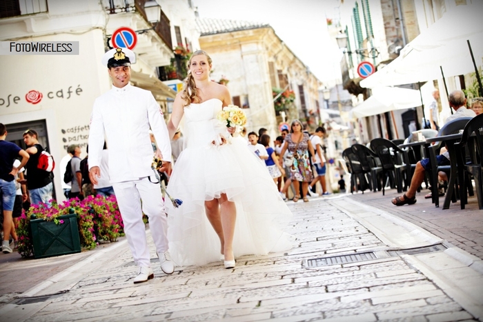 Hanno scelto di sposarsi nella cattedrale di San Michele Arcangelo, a Città Sant'Angelo, in una giornata bellissima con un picchetto d'onore della Capitaneria di Porto tutto in abito bianco.